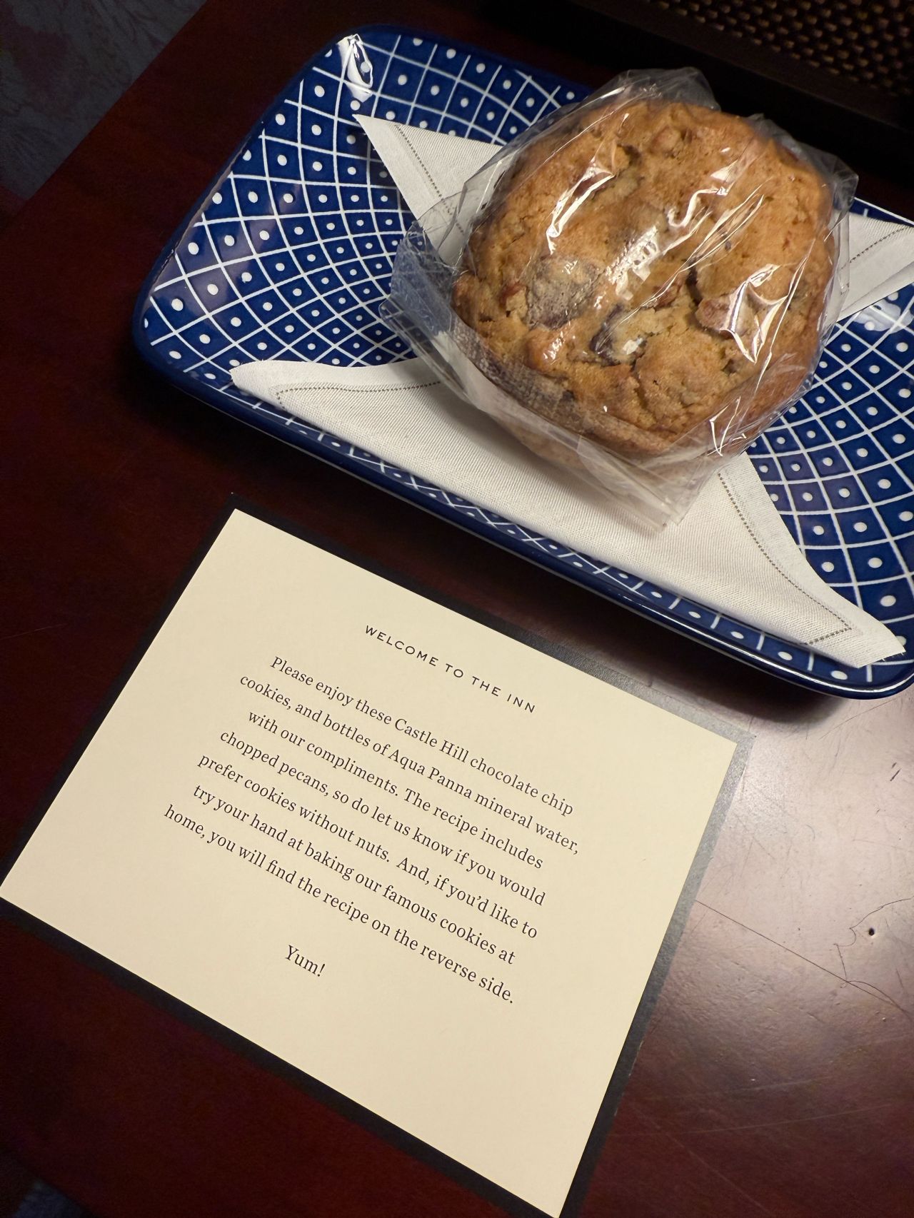 A handwritten note from the GM, welcoming me back, by name.